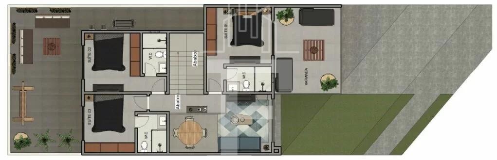 03 suítes com armários planejados, sendo uma delas com varanda, oferecendo conforto e privacidade;