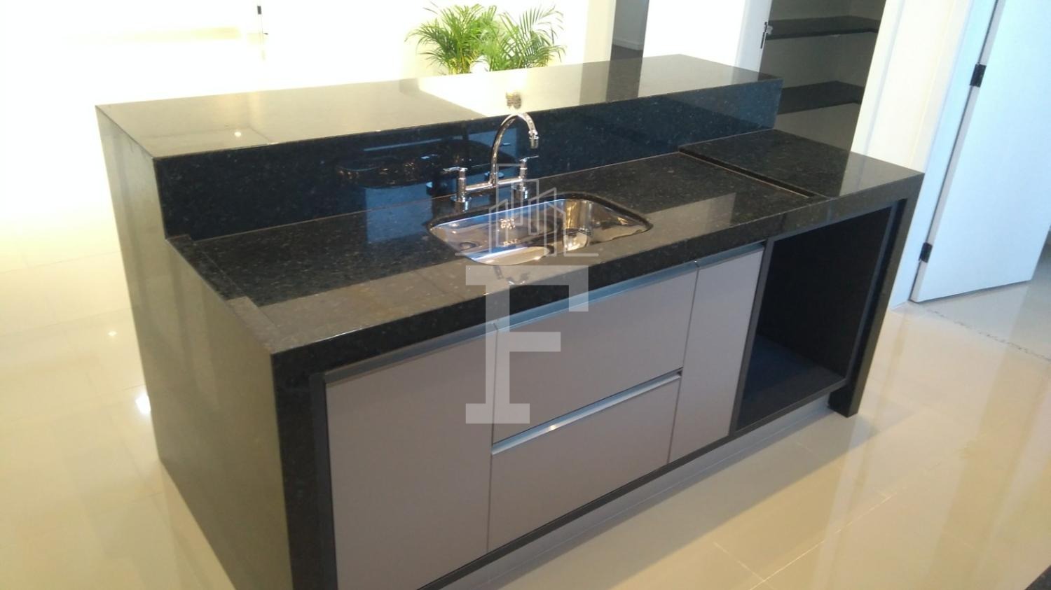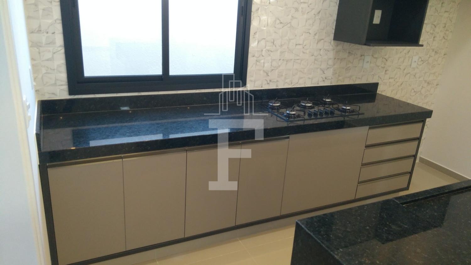 Cozinha planejada com armários, fogão e coifa já instalados