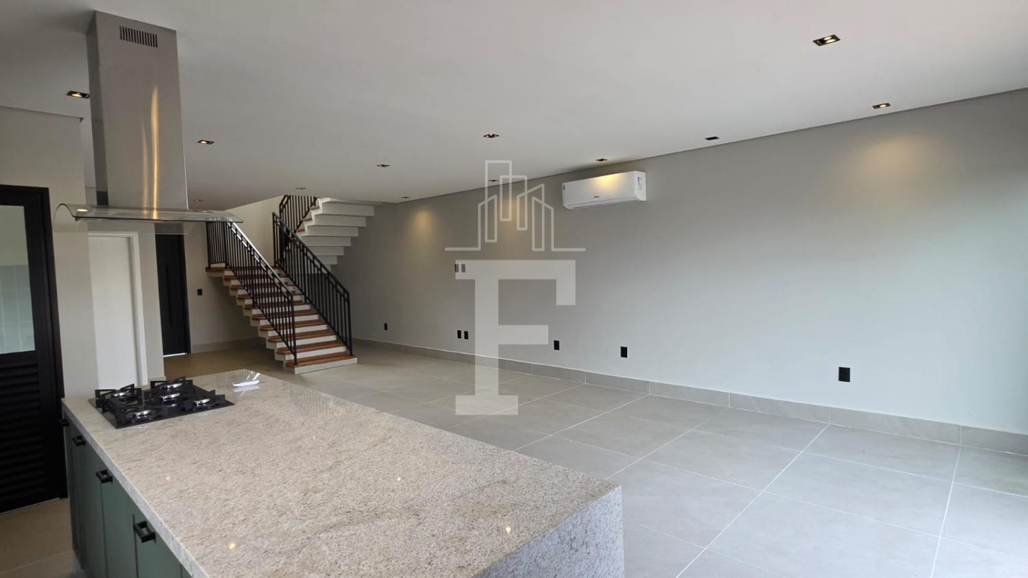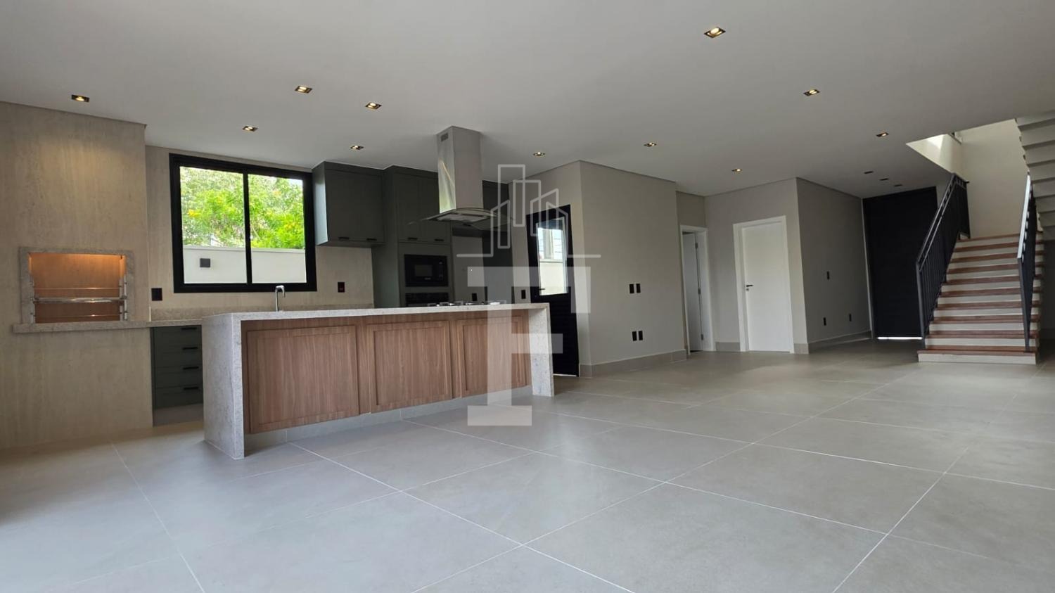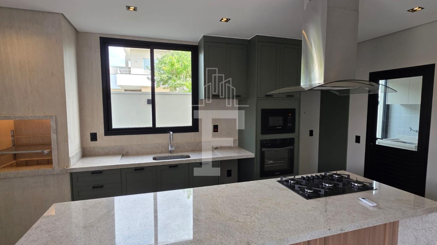 Cozinha gourmet equipada com forno, cooktop e coifa