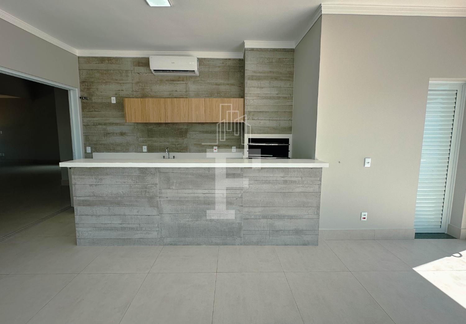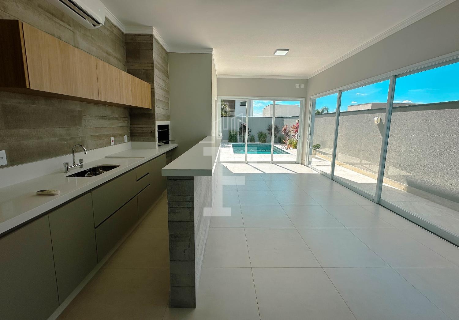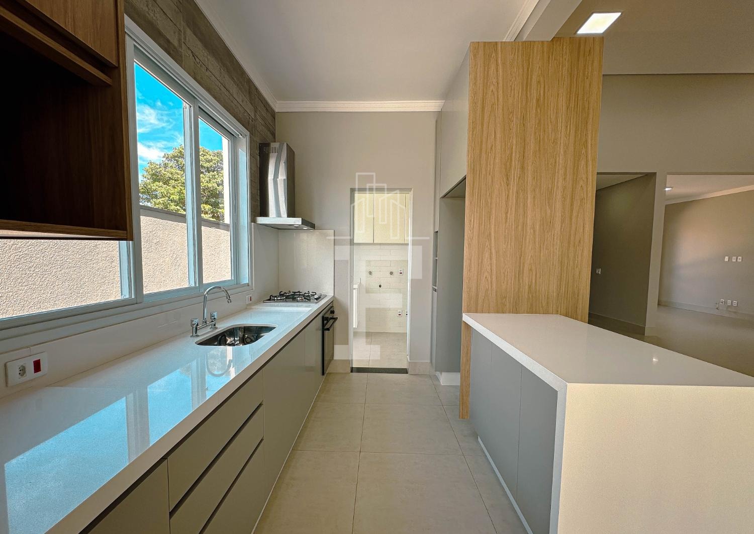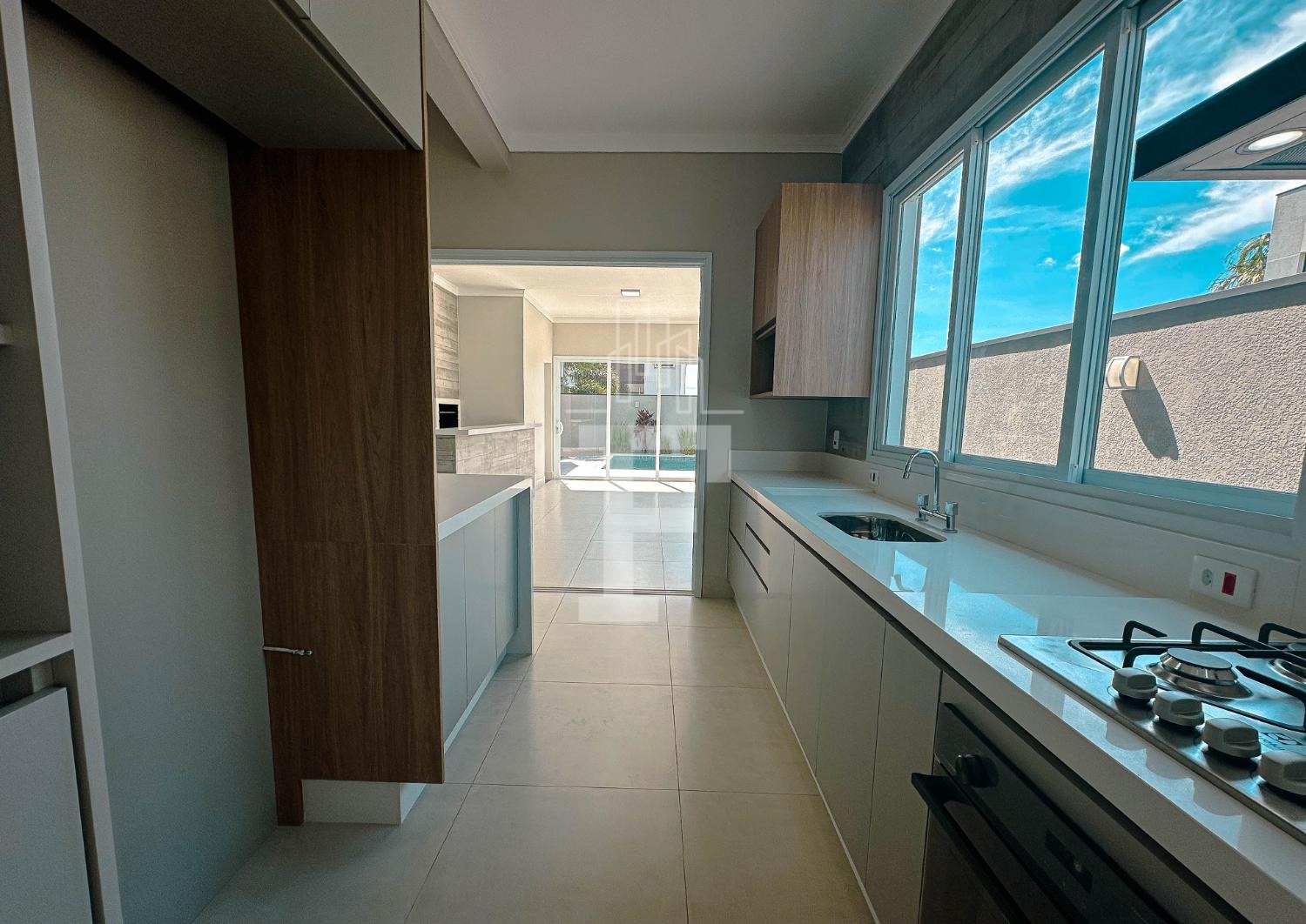 Área gourmet completa com forno, cooktop e coifa