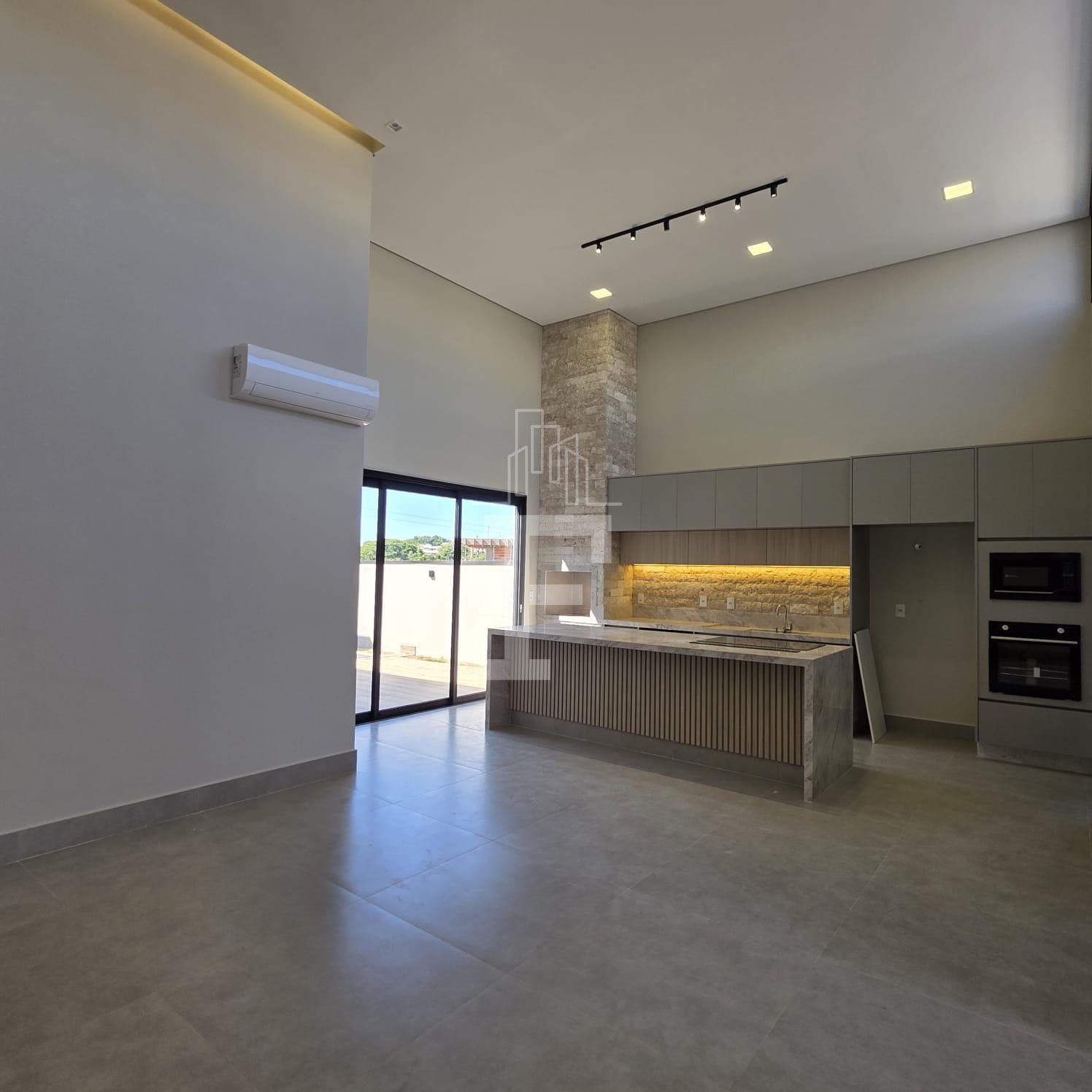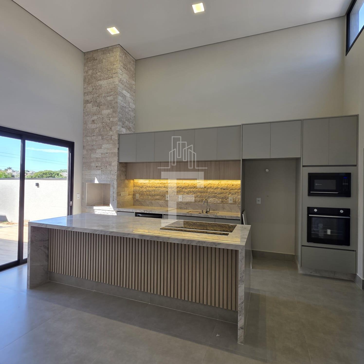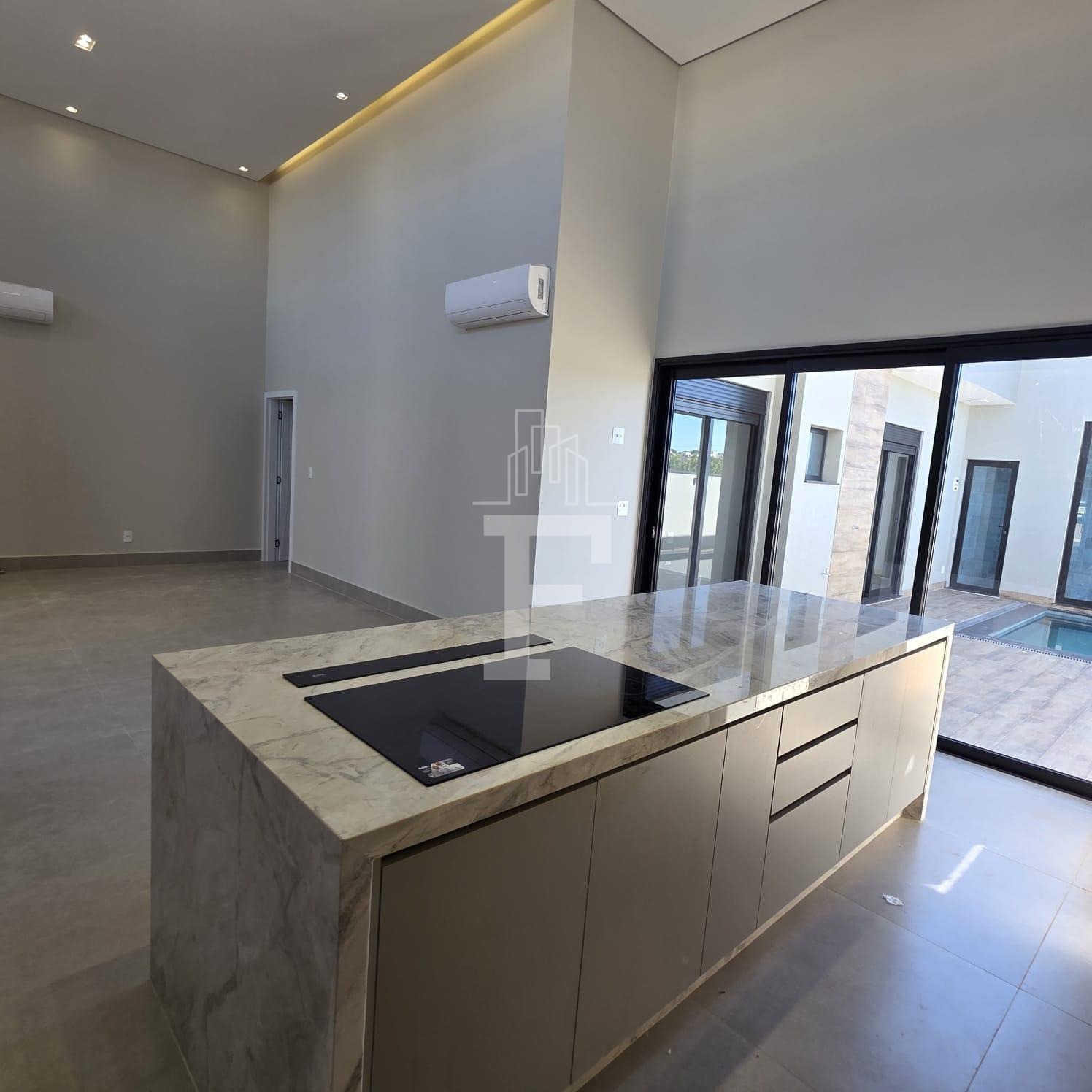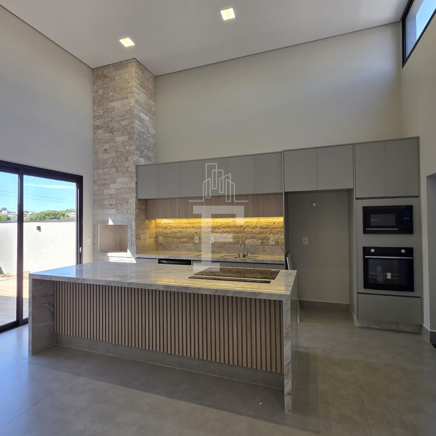 A sala de estar e jantar com pé-direito duplo garante amplitude, iluminação natural e sofisticação. A cozinha integrada à área gourmet cria um ambiente funcional e perfeito para receber convidados, com acesso à piscina privativa, ideal para momentos de lazer e relaxamento.