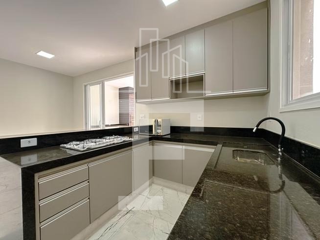 A cozinha americana é completa, equipada com armários planejados, pia em granito preto São Gabriel, cooktop, forno embutido e coifa. A lavanderia é reservada, garantindo praticidade e organização.