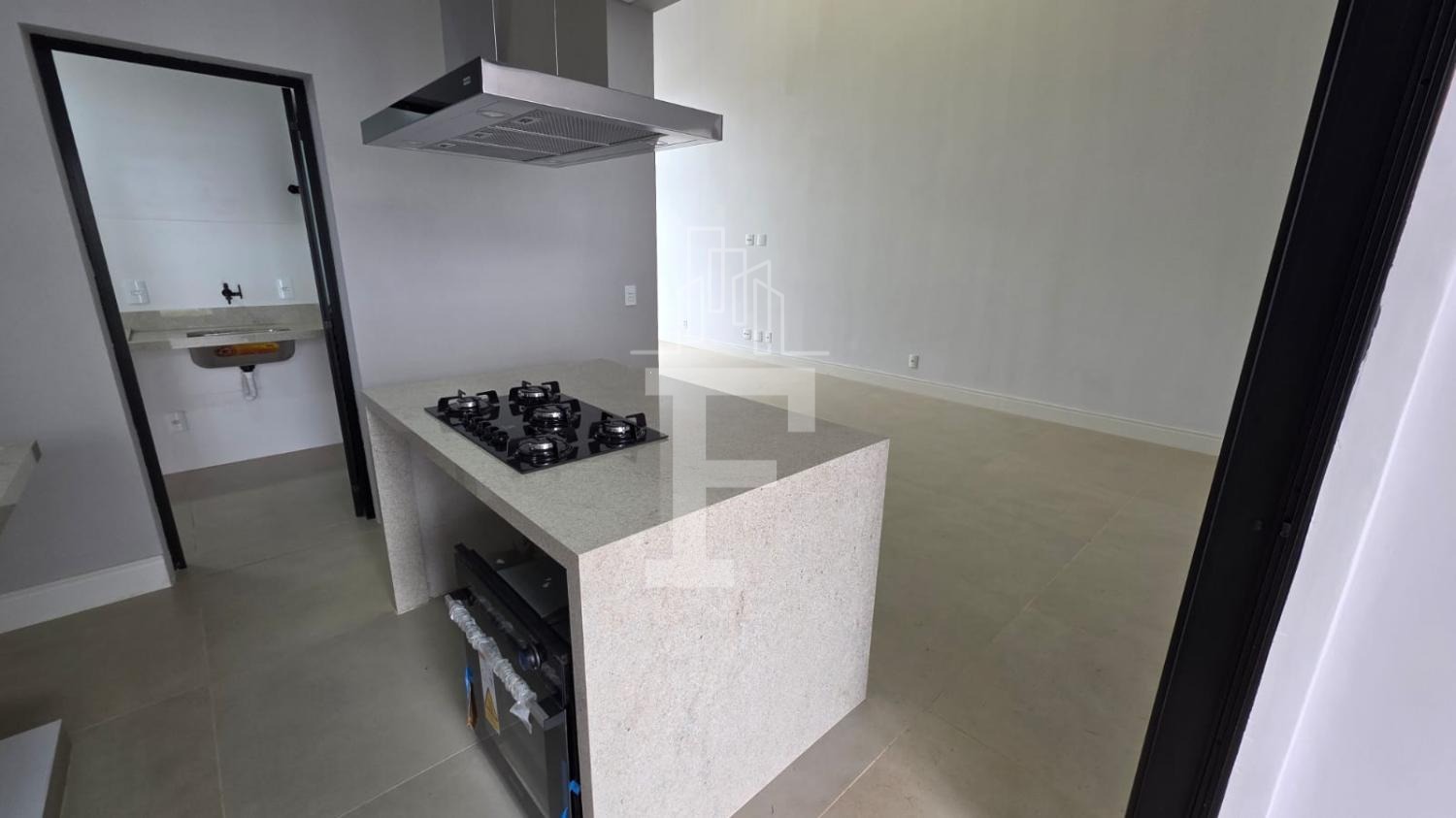 Sala ampla integrada à cozinha gourmet